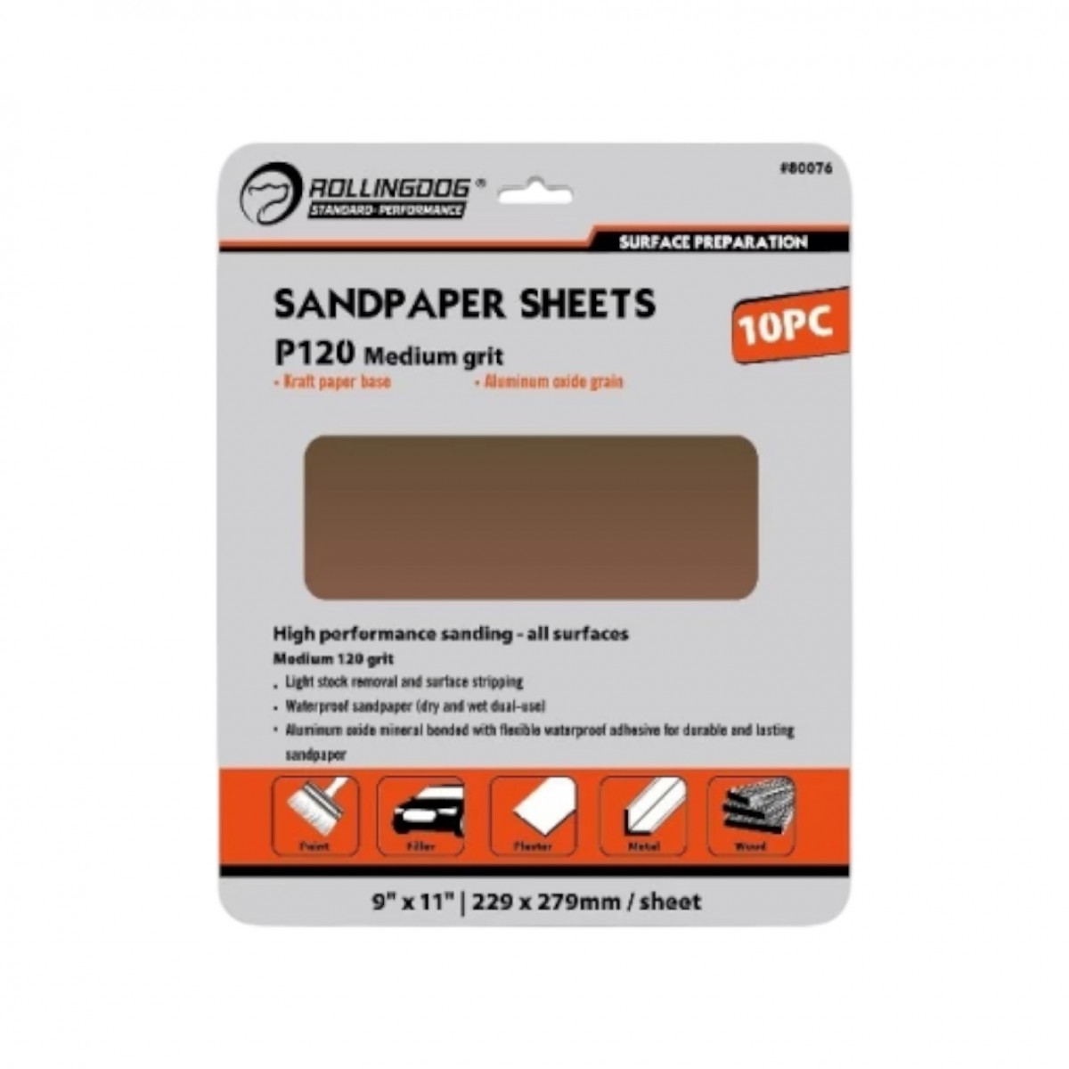 Набір наждакового паперу Rollingdog, 10шт, 230х280мм, Р120 (80076) кожен аркуш виготовлений з високоякісного оксиду алюмінію, забезпечуючи ефективне шліфування та довговічність. Гнучкий водостійкий клейовий шар дозволяє використовувати папір як для сухого, так і для вологого шліфування.