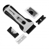 Скребок із 10 змінними лезами Rollingdog, серія Professional (50485) – універсальний інструмент, створений для очищення гладких поверхонь, таких як вікна, керамічна плитка, дзеркала та інші. Завдяки продуманій конструкції з АBS пластику і м'якому гумовому покриттю, інструмент забезпечує комфортну та безпечну роботу без ковзання. Надійна система блокування лез та можливість сховати лезо всередину корпусу роблять його ідеальним для безпечного зберігання та транспортування.